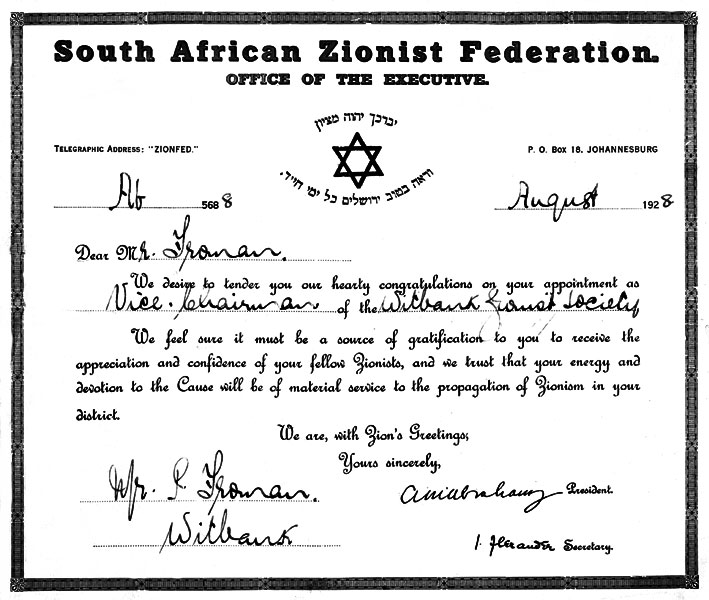 Certificate given to Philip Froman, by the South African Zionist Federation, on his appointment as Vice Chairman of the Witbank Zionist Federation in 1928