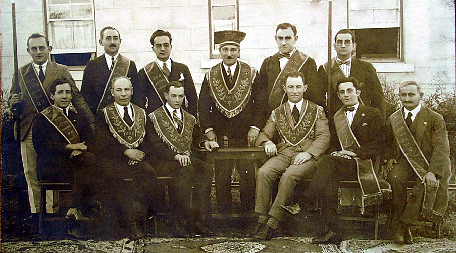 Front Row: BROS. Charlie Deiner, ?, ?, M. H. Katz, Barney Hope, ? Back Row: BROS. Isadore Behrman, ?, ?, Rabbi ?, S. J. Young, ?