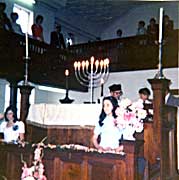 I am looking for more photos of the old Shul and Communal Hall taken from the outside and inside. Please email me if you have any. The photos below are from Mildred Goodman and Roslyn Gavronsky, taken at two Bat Mitzvahs. The first photo is from the Batvitvah of Roslyn Gavronsky, Avril Friedman, Helen Milwidsky and Maureen Friedman. The rest of the photos are from the Bat Mitzvah of Janet Goodman and Linda Morris. Click on any photo to view a larger version, then use the BACK button on your browser to return to this page.